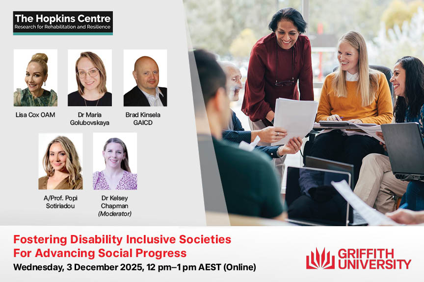 for advancing social progressJoin us to mark the United Nations International Day of Persons with Disabilities on Wednesday, 3 December 2025 (12:00–1:00pm AEST) in our online forum hosted by Griffith Business School’s Equity, Diversity and Inclusion Committee, Inclusive Futures Reimagining Disability, and The Hopkins Centre.